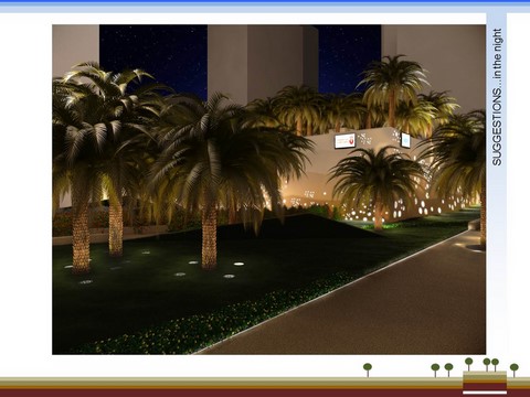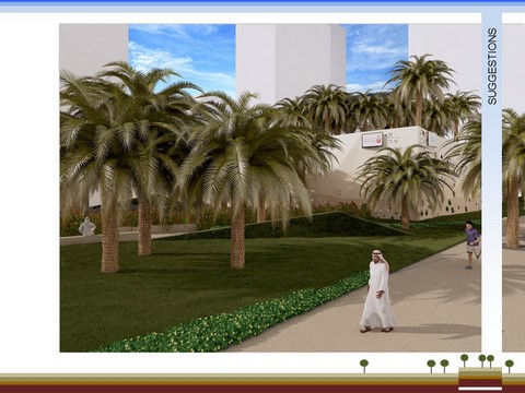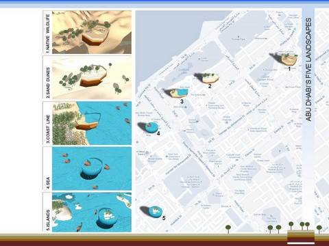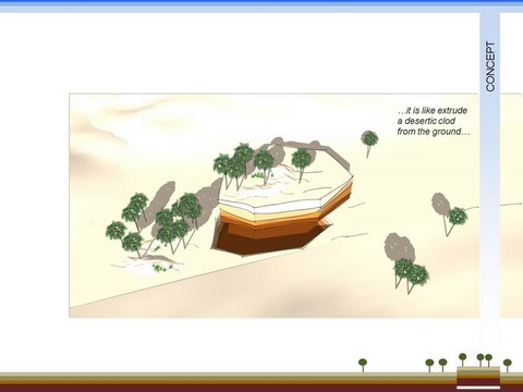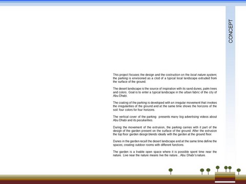 Il paesaggio del deserto è la fonte di ispirazione con le sue dune di sabbia, palme e colori. L'obiettivo è quello di portare nel tessuto urbano della città di Abu Dhabi un paesaggio tipico del dell'emirato. Il rivestimento del parcheggio si sviluppa con un movimento irregolare che richiama le irregolarità del terreno e allo stesso tempo mostra gli orizzonti del suolo: quattro colori per quattro orizzonti. Durante il movimento di estrusione, il parcheggio porta con sé parte del disegno del giardino presente sulla superficie del terreno. I movimenti terra evocano le dune del paesaggio desertico e allo stesso tempo definiscono gli spazi, creando camere esterne con funzioni diverse. Il giardino è uno spazio aperto e vivibile dove è possibile un contatto diretto con la natura. Vivere vicino alla natura significa vivere la natura ... la natura di Abu Dhabi con i suoi cinque unici paesaggi: le dune, l'entroterra montuoso, la costa, il mare e le isole.