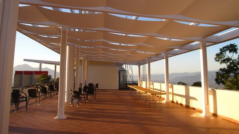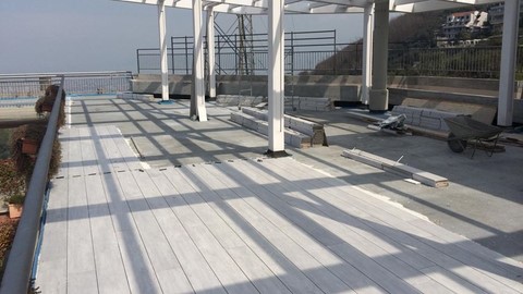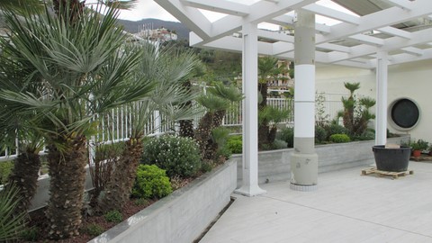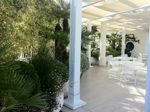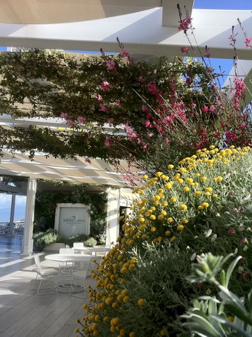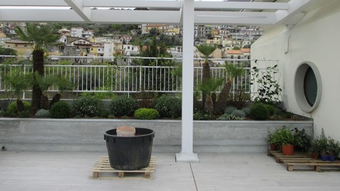 Il Grand Hotel Meridiana è un romantico affaccio sulla piana di Pompei e sul Vesuvio; è un luogo incantevole dove l'ottima cucina e l'impareggiabile ospitalità si sposano con un paesaggio unico ed irripetibile: è il luogo ideale per matrimoni, eventi e cerimonie. Qui abbiamo guidato il restyling del terrazzo donando eleganza e semplicità al roof garden per esaltare la bellezza del panorama. Al bando l'eccesso e la varietà di colori e di materiali, al bando geometrie e tessiture avulse dal contesto... Il colore di fondo è il bianco, poche ma decise pennellate nelle fioriture che si alternano nell'anno... una cascata retroilluminata, incorniciata da un muro verde di specie mediterranee, è il ben venuto che gli ospiti ricevono appena usciti dall'ascensore... una seduta alla base della cascata offre un punto preferenziale per la foto ricordo sul terrazzo...